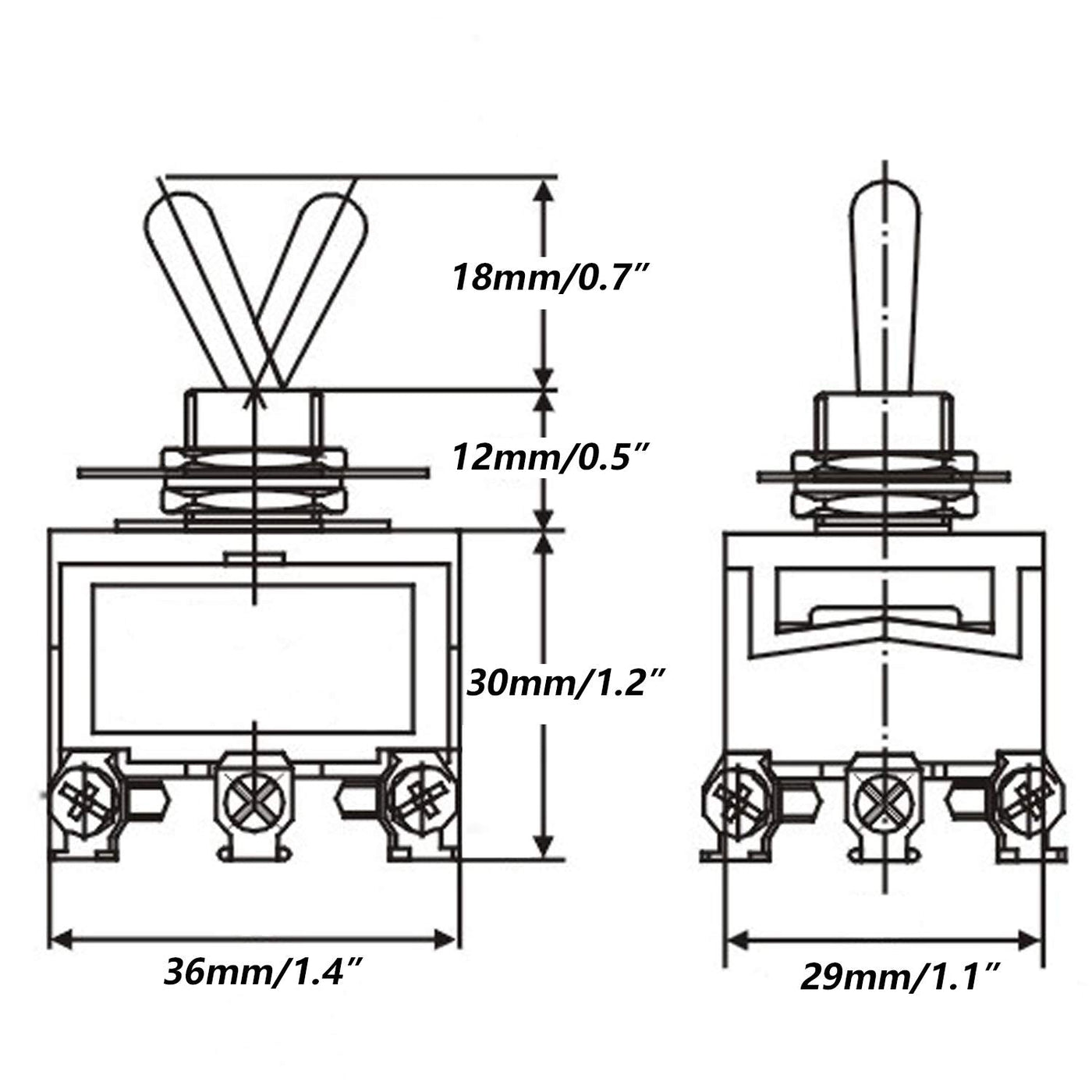 Read more Product Name:Toggle switchConnector type:3PDTType:ON-OFF-ONNumber of terminals:9 Screw TerminalsMaterial:Plastic and metal Read more Product Name:Waterproof Cap CoverMaterial: RubberColor: BlackTall: 26mm/1.02"Fits Screw : 12 mmscrew on, tough, weather resistant rubber covers protect all toggle switches from moisture and dust when you applied it to a boat, yacht, vessels and other marine. Read more Features Thick handle Iron dust cover is designed with strong hardness, wear resistance, no deformation and long service life. Silver contacts Thick copper parts, large contact area, good conductivity and long service life. Flame retardant shell Using high-strength PC material, it is flame-resistant, wear- resistant, high temperature resistant and has good electrical insulation. Copper Pins Copper pin, fast conductivity, screw connection, sufficient current, strong conductivity. Read more Application range The switch is built by high quality industrial material, widely applied to different Cars, Marine and used for Critical lights, Chassis lamps, Fog lamps, Dome lights. 2 Position 9 Terminal ON/ON 3PDT Toggle Switch 2 Position 12 Terminal ON/ON 4PDT Toggle Switch 3 Position 12 Terminal ON/Off/ON 4PDT Toggle Switch 6 Pin 3 Position (ON)/Off/(ON) DPDT Momentary Toggle Switch 6 Pin 3 Position ON/Off/ON DPDT Toggle Switch 3 Pin 2 Position ON/ON SPDT Toggle Switch Number of termin 9 Pin 12 Pin 12 Pin 6 Pin 6 Pin 3 Pin Connector type 3PDT 4PDT 4PDT DPDT DPDT SPDT Operation Mode ON/ON ON/ON ON/OFF/ON (ON)/OFF/(ON) ON/OFF/ON ON/ON Action Type Latching Latching Latching Momentary Latching Latching Switch Rating 15A 250V AC, 10A 380V AC 15A 250V AC, 10A 380V AC 15A 250V AC, 10A 380V AC 15A 250V AC 15A 250V AC 15A 250V AC