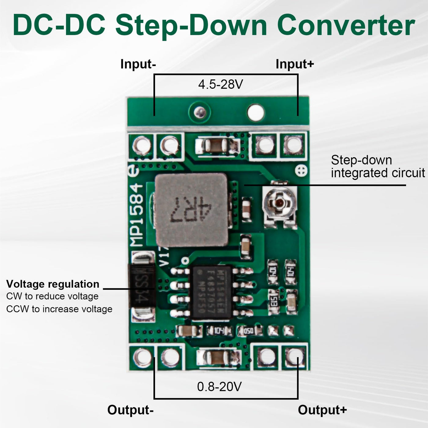 - MINI DOWN CONVERTER Each DC/DC step-down converter measures only 22 x 17 x 4mm and weighs 2.7g. This DC/DC step-down converter module is ideal for projects with limited space and can be easily integrated with portable devices, drones, embedded systems or DIY devices