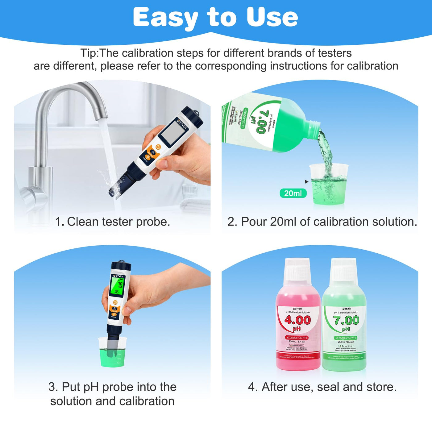 - Easy to Use: It is ready to use after opening the lid, without the tedious dissolution process, which improves the efficiency of maintaining the tester. EZTOCH pH calibration buffer is not only suitable for all brands of pH testers, but also for all pH pens and pH meters, making it the first choice for various calibration needs