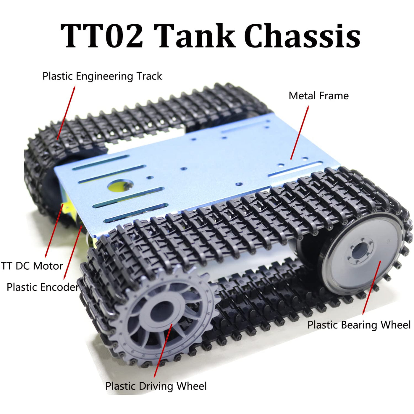 - PACKAGE INCLUDED -- This TT02 robot tank chassis kit includes 1pc metal plate, 2pcs plastic driving wheel, 2pcs plastic bearing wheel, 2pcs engineering plastic tracks and 1set screw kit. Dimensions: 7.6 x 6.4 x 2.4 inches. Any question about the tank chassis kit, please do not hestitate to contact us, and we will reply you as soon as possible.
