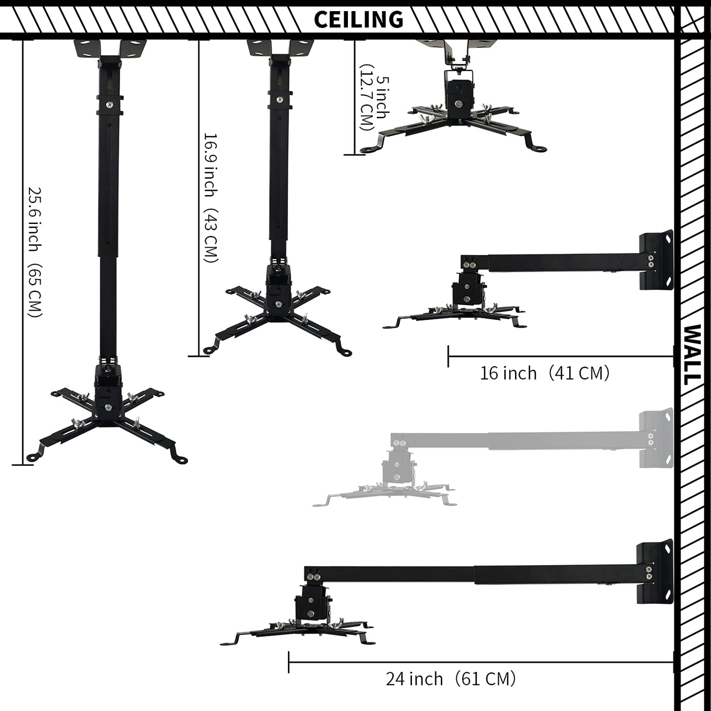 - EASY TO ADJUSTThe projector holder is fully adjustable with +/- 30 degree tilt, +/-30 degree swivel, hitting all the right viewing angles. The projector ceiling mount adjustable height extends from 16.9" to 25.6" from the ceiling surface and 13.8" to 22.5" from the wall. Flush ceiling mount with a minimum length of 5 inches.