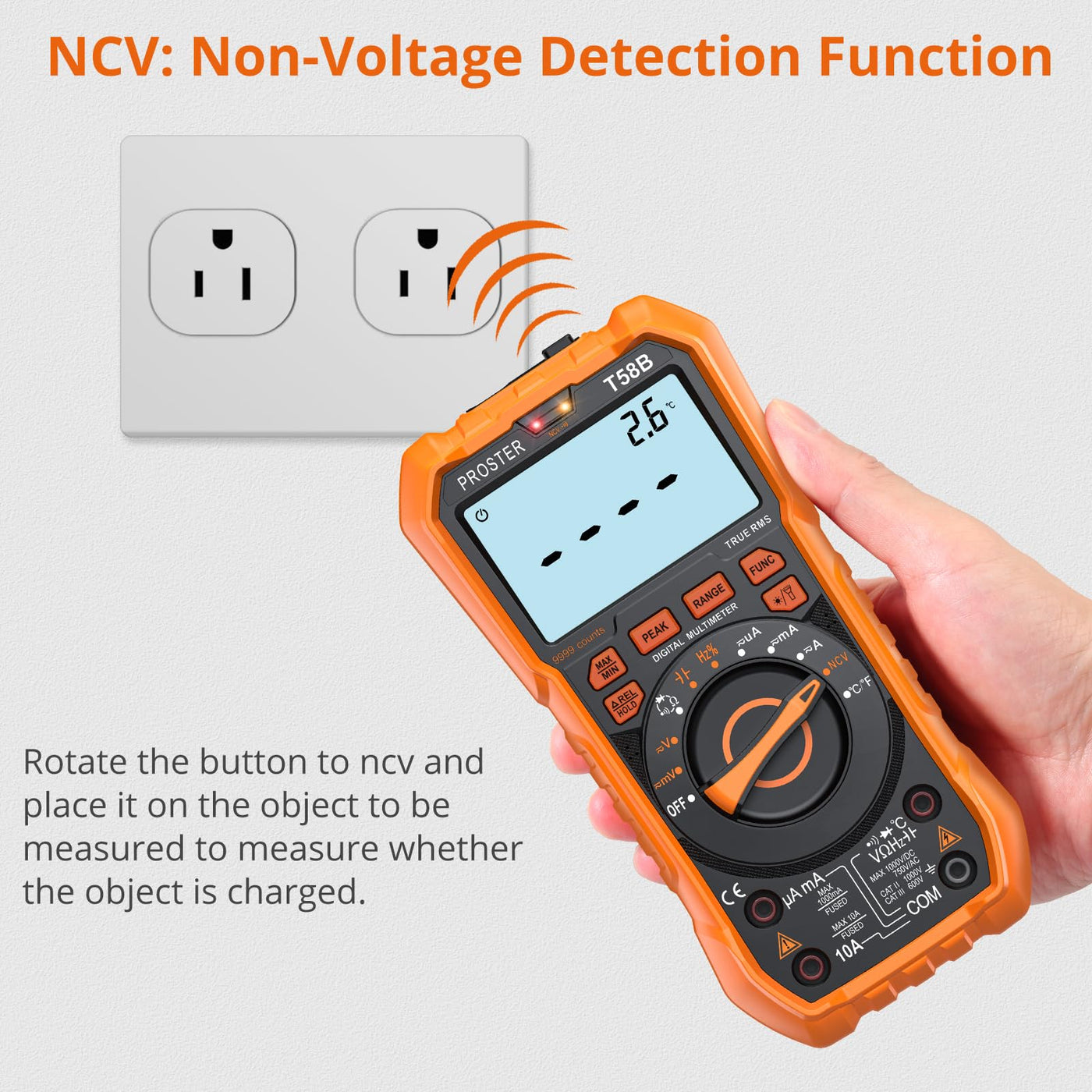 - Multimeter 9999 count: AC/DC voltage, current, resistance, capacitance, frequency, duty ratio, temperature, NCV(non-contact voltage), diode, transistor and continuity. Data hold, Back light, FlashLight, Over load protection, Low Battery Indication