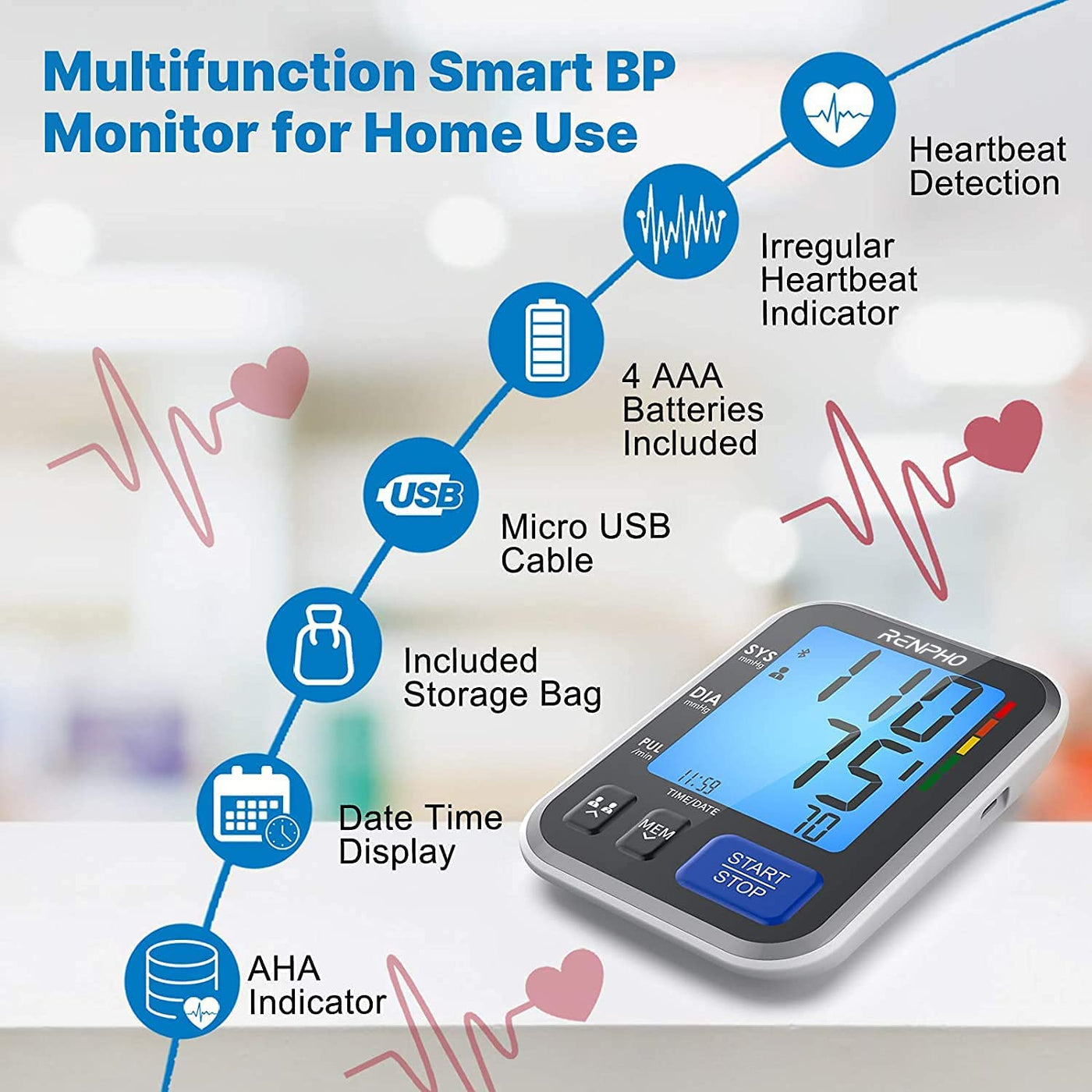 - High Accuracy: The RENPHO home wireless blood pressure monitor accurately detects your blood pressure and heart rate, displaying AHA levels on the screen in 45 seconds or less.
