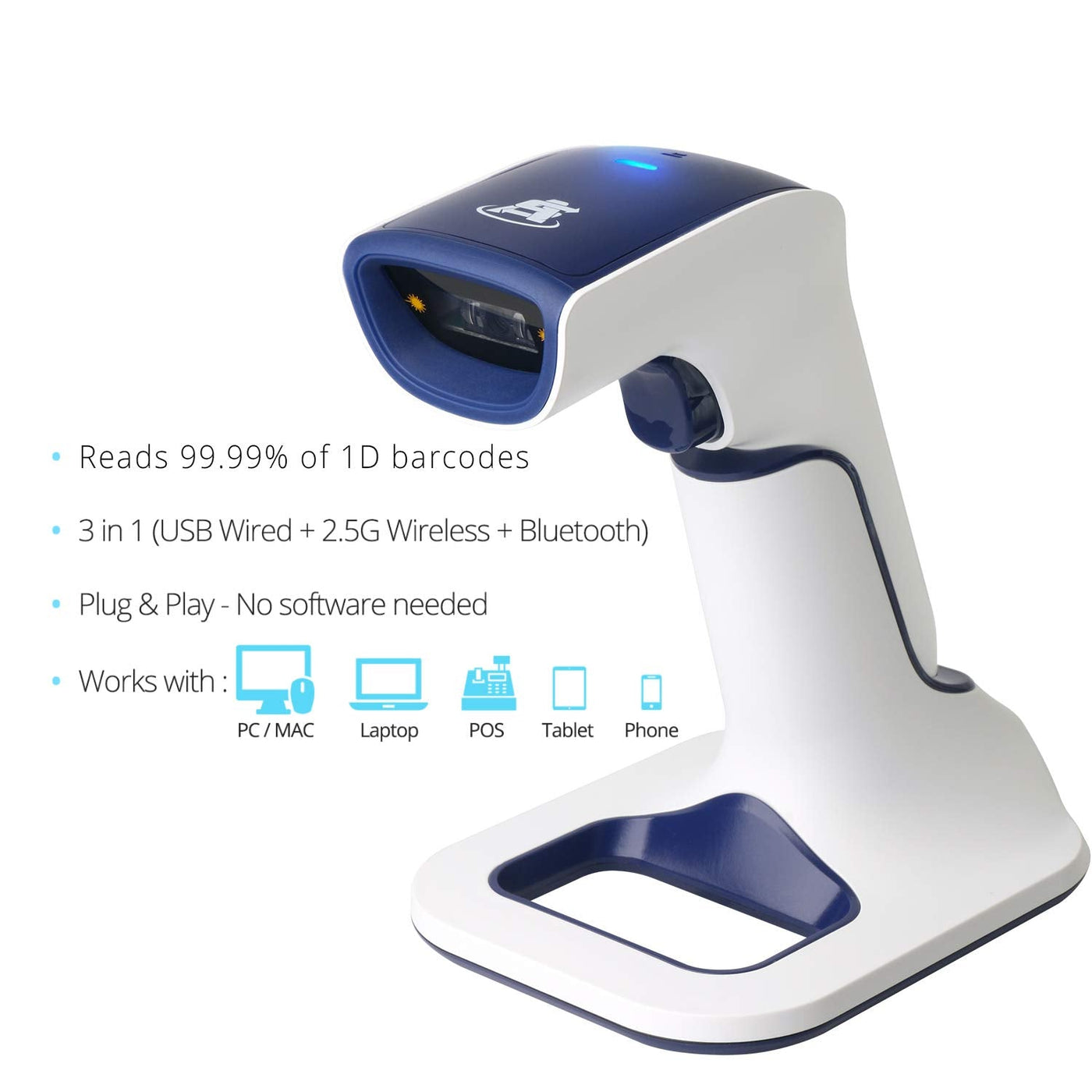 - NEXT GEN SMART CHARGING STAND: One base that can do it all. Wireless Transmission from stand to scanner. Holds scanner. Charges scanners built in rechargeable Li-Ion battery via lighting connectors