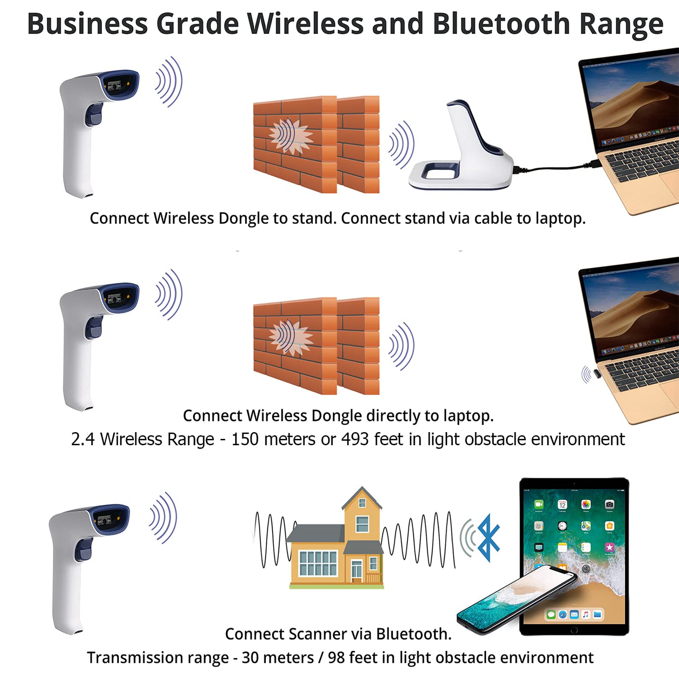 - TRANSMISSION RANGE: This linear barcode scanner has a transmission range of up to 493 feet in an obstacle free environment and around 98 ft in environments with medium density obstacles. Transmission speed can be adjusted in order to scan barcodes faster.