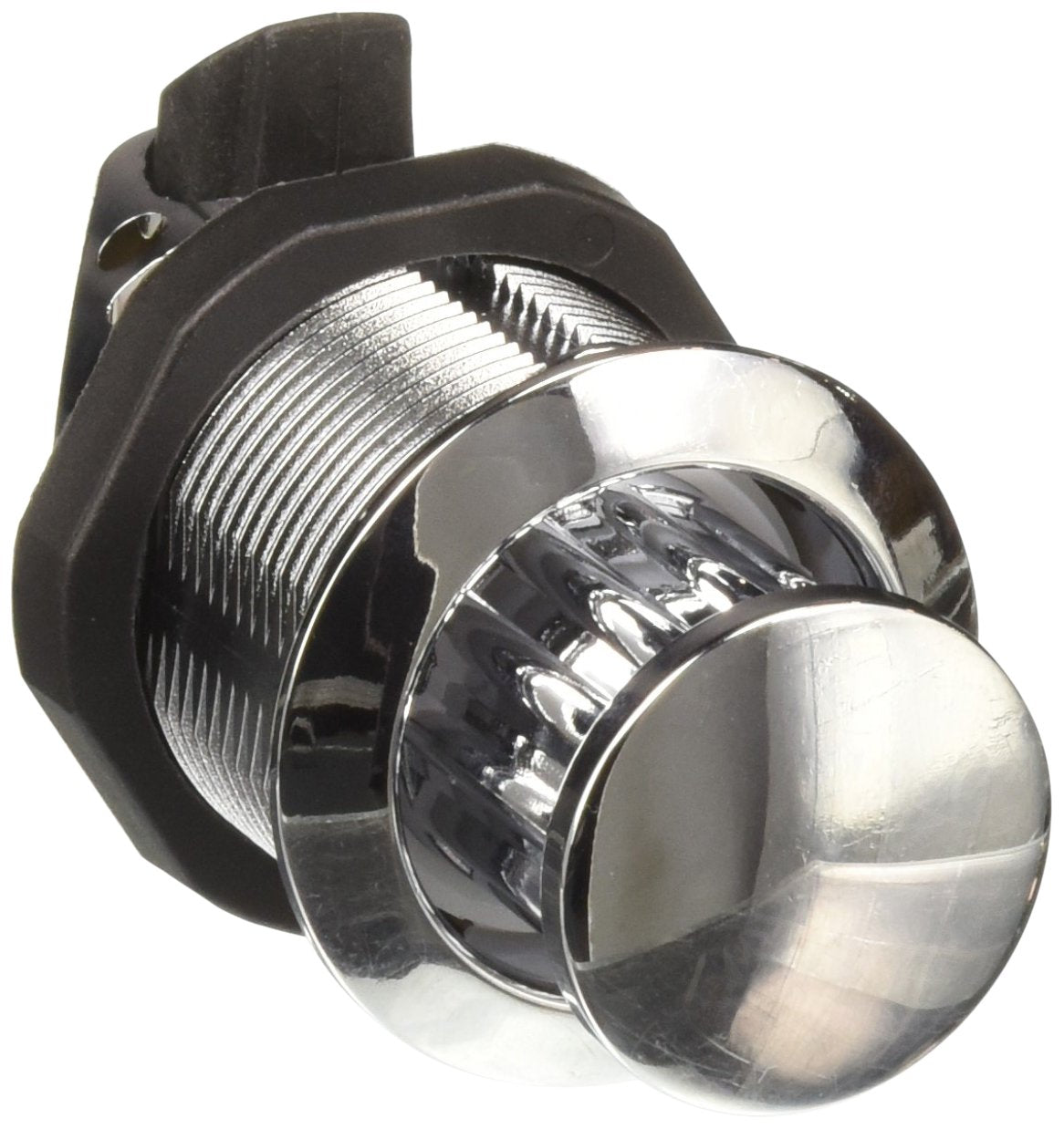 Latches - Push-To-Close Latches - Knob stores flush, pops out at a touch. Turn the knob to open, push to close. Latches securely with knob in or out. Accommodates misalignment. Use on flush, surface mount, or perpendicular doors. Quick 1.25" diameter round hole installation. Polycarbonate/ABS blended material with glass filled black nylon keepers, nut and pawl. Corrosion and UV resistant. Chrome plated. Internal springs are Type 304 stainless steel. Maximum working load 50 lbs. Available with serrated pawl for self adjusting grip or regular pawl for fixed grip. Keepers included. Keeper for fixed grip is stainless steel.