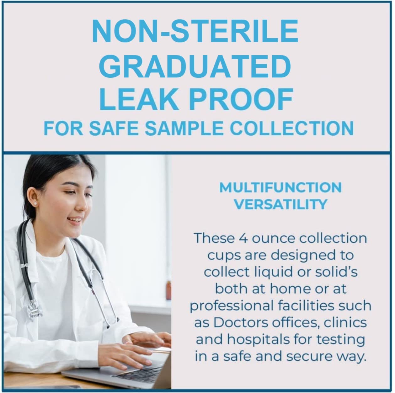 - MULTIFUNCTION VERSATILY These 4 OZ collection cups are designed to collect liquid or solids both at home or at professional facilities such as Doctors offices, clinics and hospitals for testing in a safe and secure way.