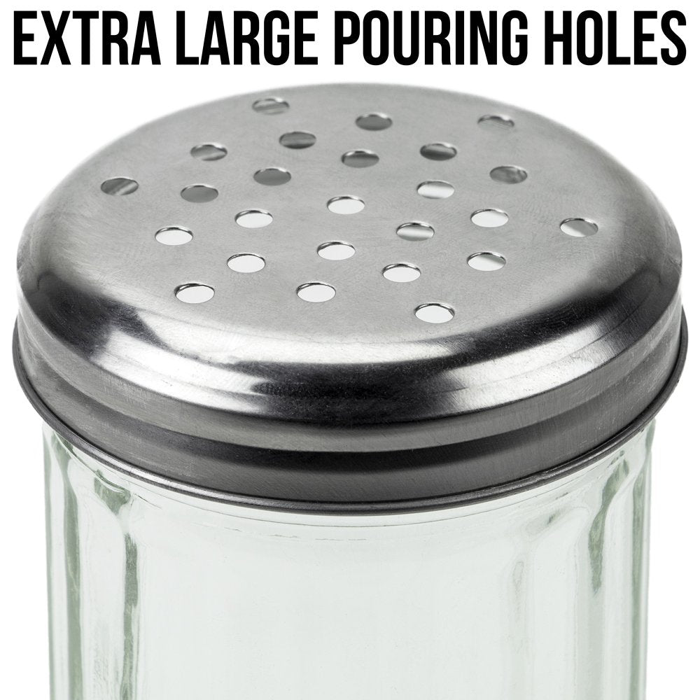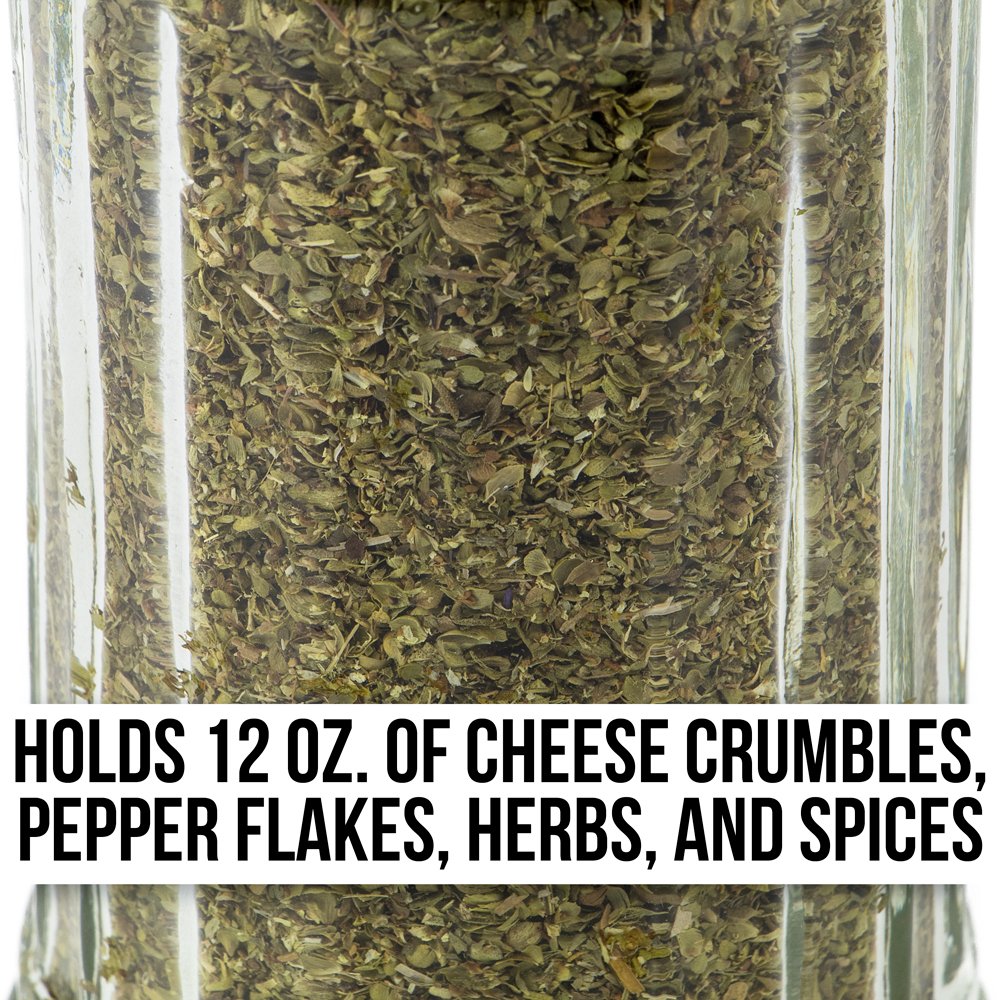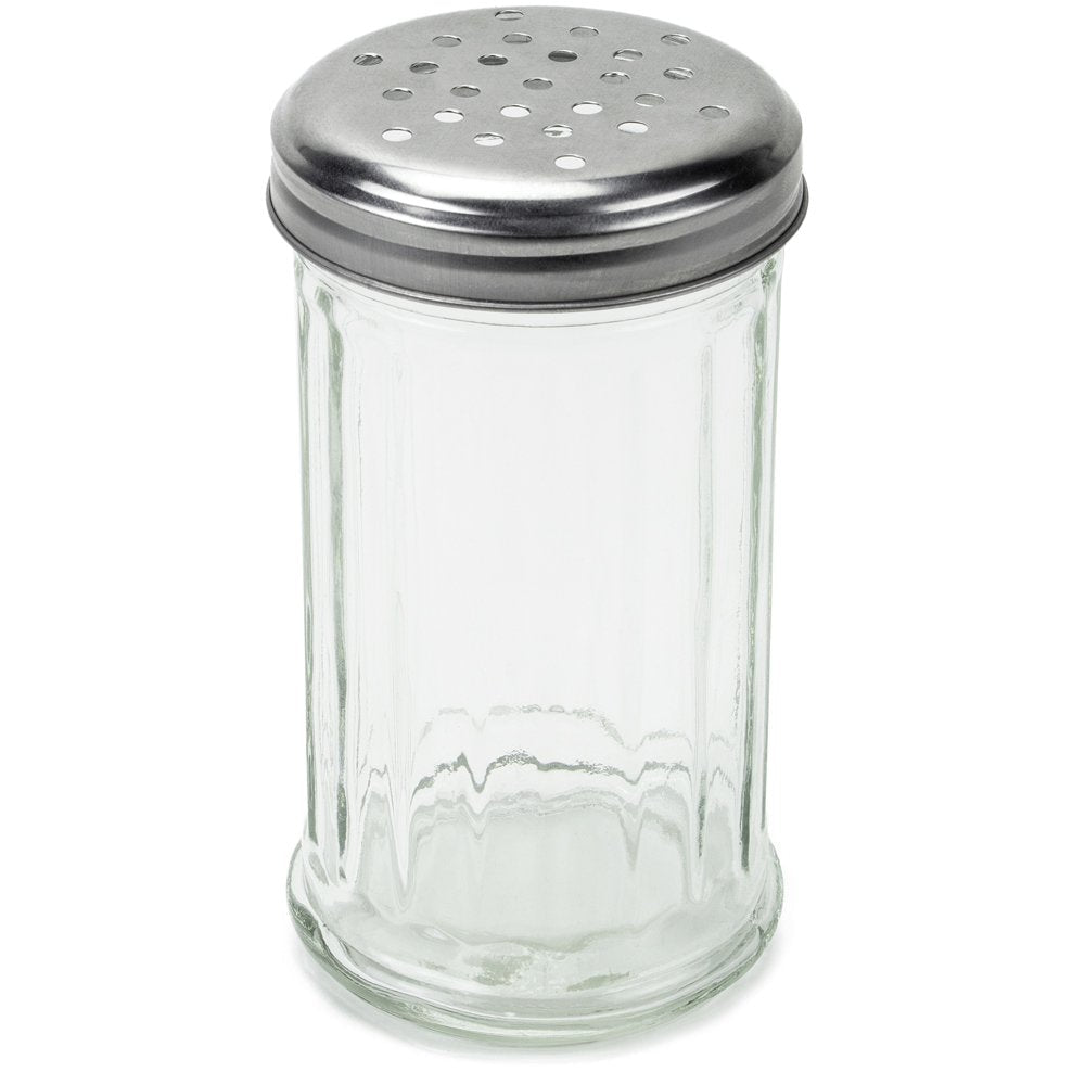 Shake It Up, Pour It OutAdd some flavor to your food with a few simple shakes! This commercial grade straight-sided glass flute with metal lid will add a classic touch to your table. Each shaker holds 12 ounces of your favorite cheese crumbles and spices. Add some Parmesan, mozzarella, or red pepper flakes! They make a great addition to any diner, Italian restaurant, pizza shop, or even your kitchen table. You can keep these in the back of the kitchen for your chefs and wait staff to use as well. When you're finished with a shaker, simply wash it out and use it again! Dishwasher safe, top rack only. Why You'll Love It:This shaker will add a restaurant quality feel to your table or counter top. The wide-mouthed design and twist-off lid makes it easy to refill without making a mess. The holes on the top of the lid are extra-large to easily fit larger flavors like cheese crumbles, pepper flakes, and herbs.