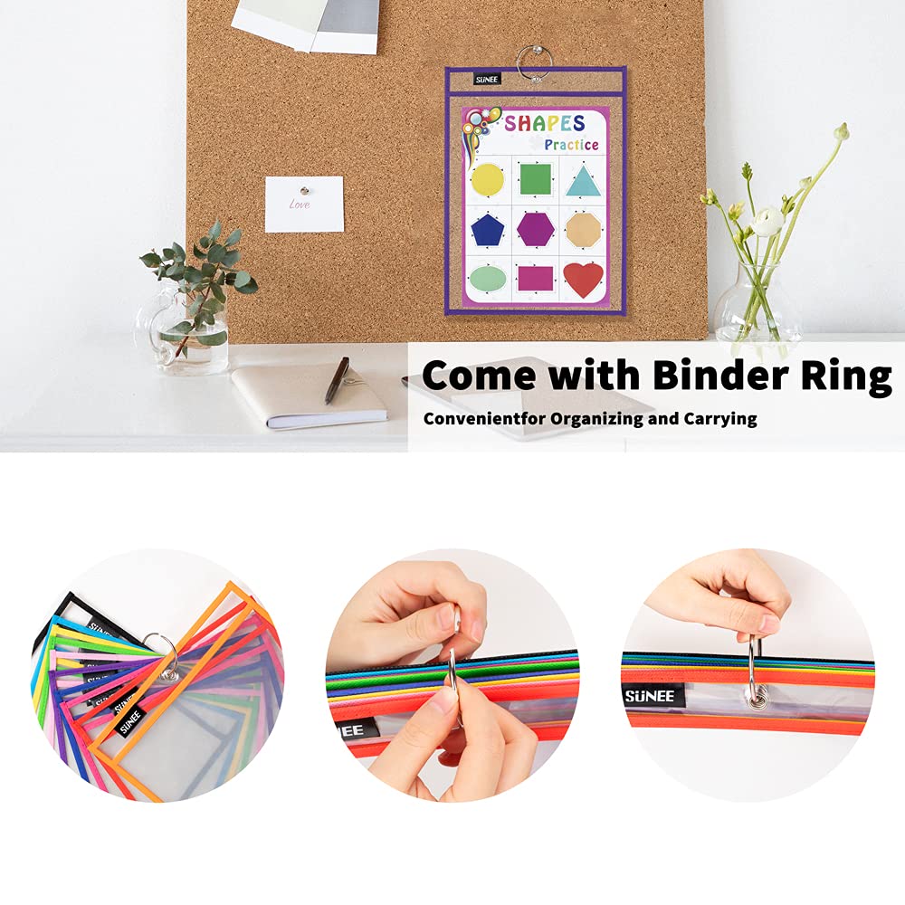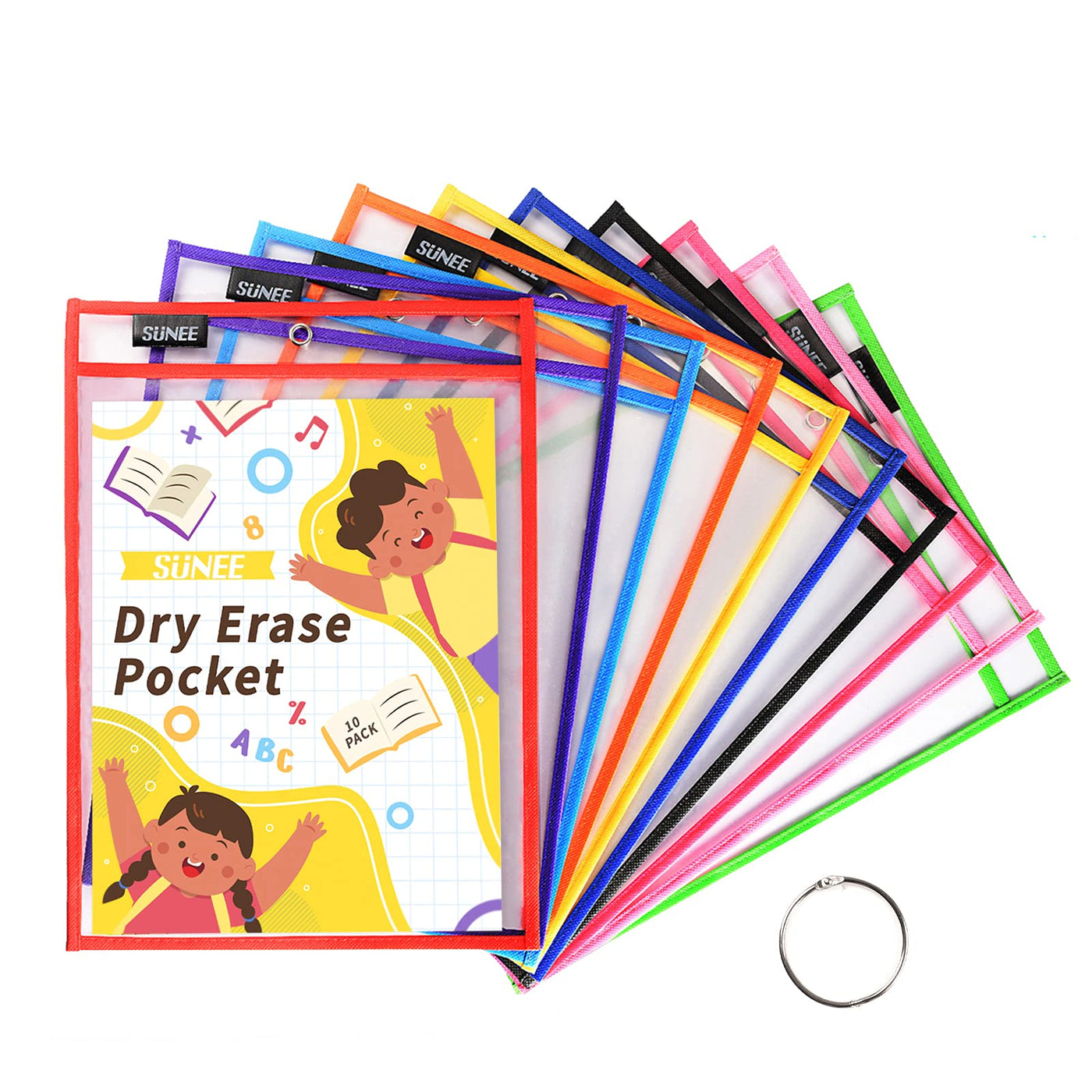 SUNEE 10 Packs Oversized Reusable Dry Erase Pocket Sleeves with Binder Ring, 10 Assorted Colors 10x14 Ticket Holders, Clear Plastic Sheet Protectors, Teacher School Classroom Supplies