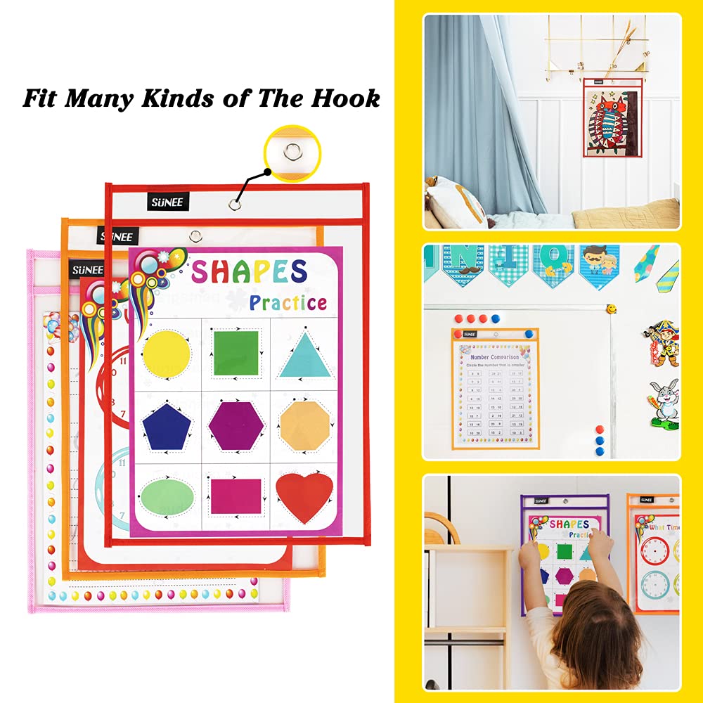 - Smart Design - At the top of our dry erase pocket, the black tag is a pen loop, and the middle hole allows you to hang it vertically on the wall for displaying artworks, worksheets, small samples.
