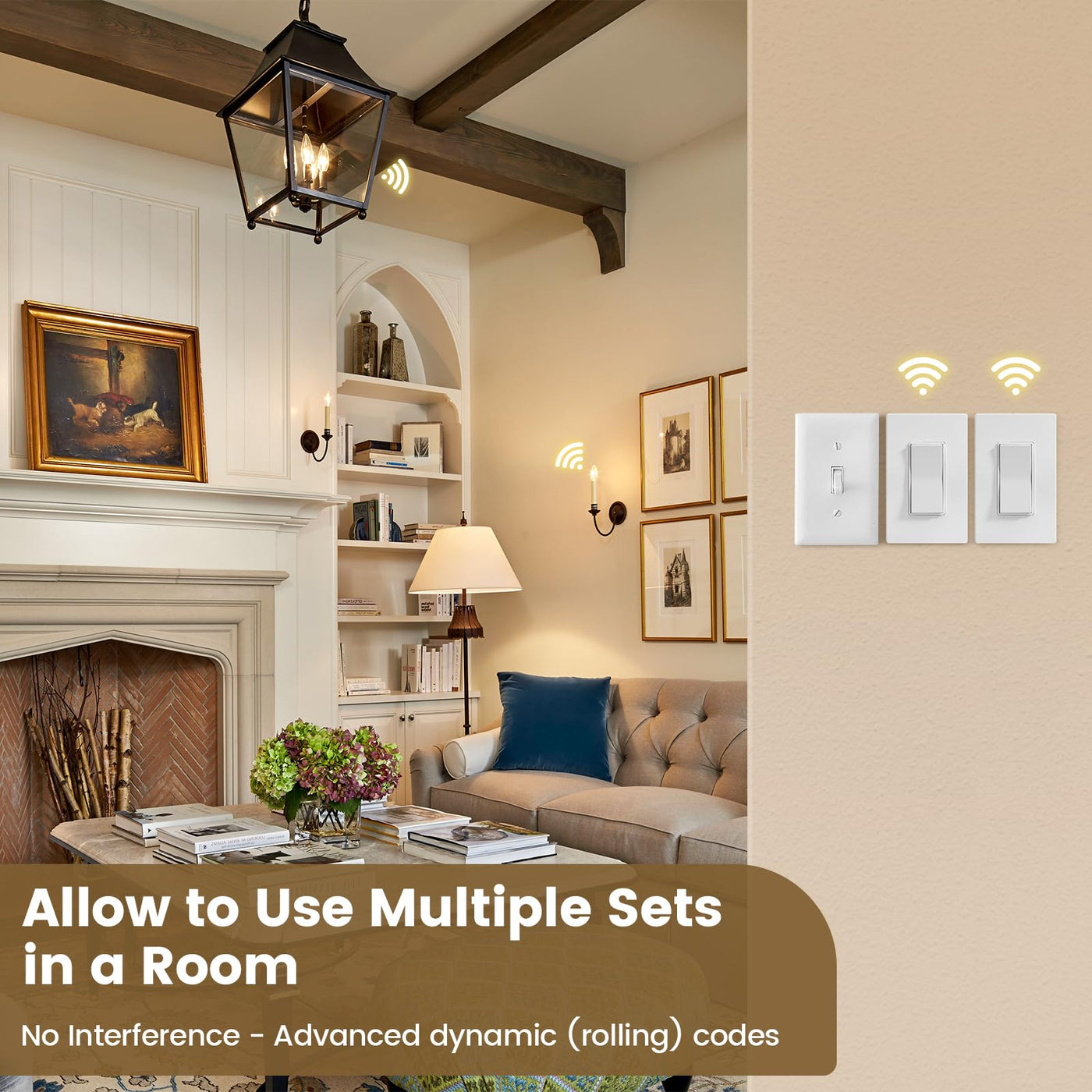 - Multiple Sets in a Room without Interference Utilizing rolling/dynamic codes, this wireless light switch kit allows you to install multiple separate kits in the same house, operating independently without conflicts or interference. Pre-programmed for immediate use, the kit is rated at 15A/1875W, compatible with nearly all types of lamps and bulbs.