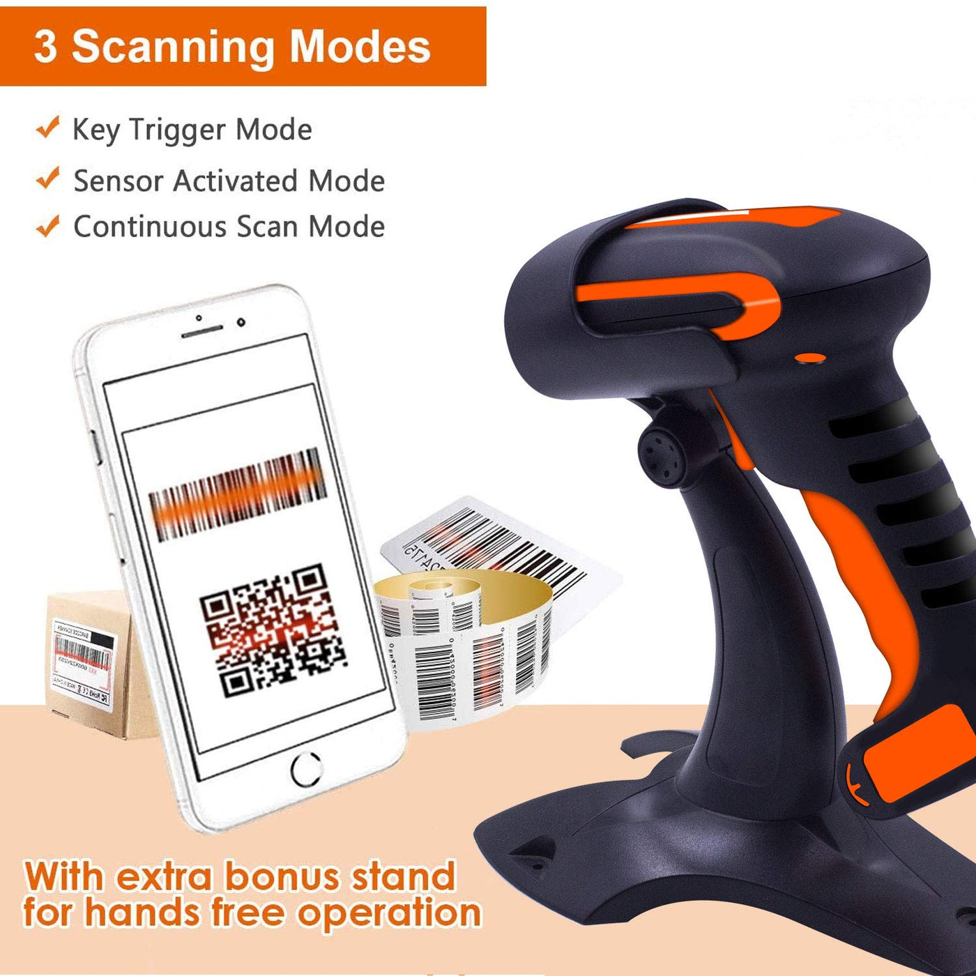 - [3 Scanning Mode Available ]:1. Traditional manual trigger mode. 2. Intelligent sensor mode. (scan when changes in ambient brightness was detected) 3. Continuous scan mode. Both sensor mode and continuous scan mode allows for hands-free operation without pulling the trigger button when the scanner sits in the Stand.