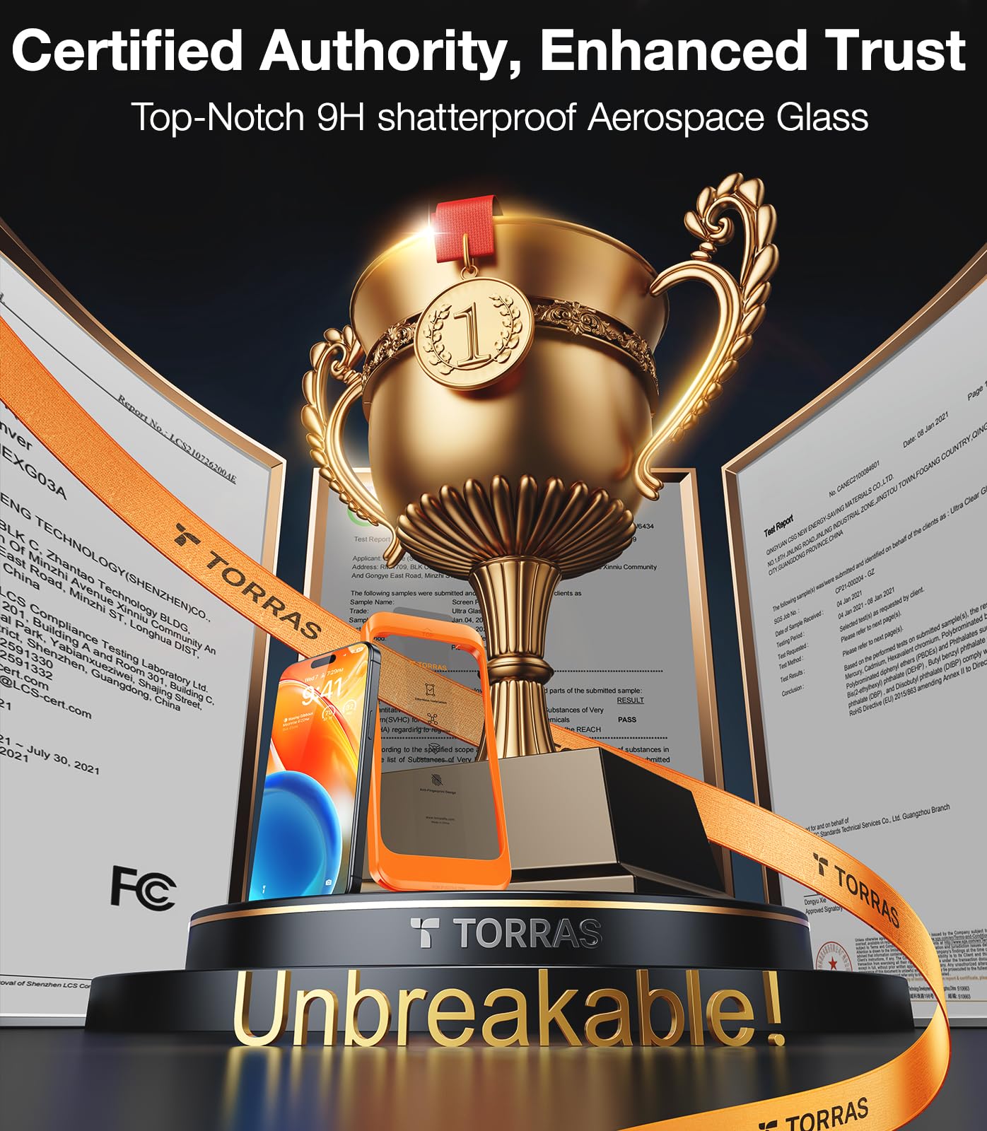 TORRAS Top-Notch Diamond Shield for iPhone 15 Pro Max Screen Protector [ 9H+ Military-Grade Protection] Unbreakable Shatterproof Tempered Glass for iPhone 15 ProMax Full Coverage Screen Protector,