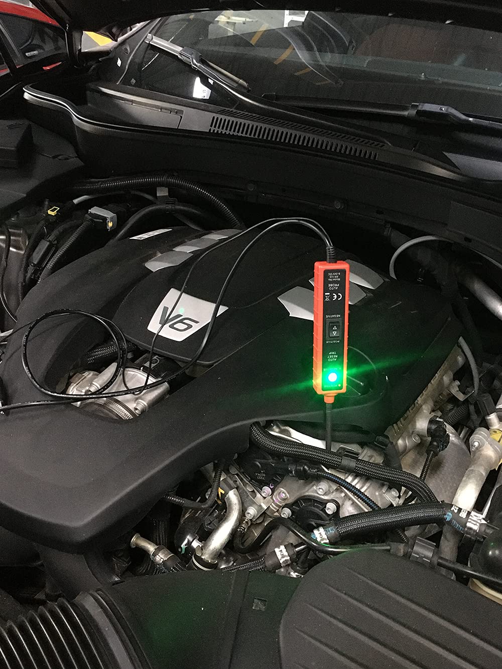 This circuit probe is an Electrical Tester for reducing diagnostic time in automotive electrical systems. Works on all 6-24V, including cars, boats, trailers, relays, and more, can test for continuity, test for polarity, test for bad ground contacts, check switches, relays and the on-off of diodes, fuses and circuits, track and locate short circuits. A good helper for both professional mechanics and home-use customers! MULTIFUNCTONS: Polarity TestingContinuity TestingGrounding TestShort Circuit Following and LocatingTesting Components in Vehicle's Electrical SystemTesting Components out of Vehicle's Electrical SystemJumper Lead TestSelf-Test The LED indicator and buzzer warning can help you clear problems at a glance Help you to test the positive and negative polarity of contact in the circuit of vehicle The probe tip contact to the positive"+", will light the LED indicatorThe probe tip contact to the negative"-", will light the GREEN indicator MULTI-FUNCTIONS Activating Components IN the Vehicle's Electrical System When component's control switch is located at the side of positive terminal of component, press button to "-" side to have LED light RED. Contact probe tip to the positive terminal of component. The component will be activated. Activating Components OUT OF the Vehicle's Electrical System Use the probe tip together with the auxiliary ground lead, can activate the components, thereby testing their function. Read more high sensitivity probe provides you quick and accurate detectionthe clamps with strong bite force which not easy to fall off13ft cable allows you access and test any electrical system easily Warm Note: Be more careful when operating it, due to the sharp probe tip. Package: 1 x Power Probe 1 x Probe Tip 2 x Clips 1 x English User Manual Specification: Operation voltage: 6-24V DC Material Type: plastic and stainless Cable length: 4m / 13.12ft Item size: 225 x 30mm / 8.85 x 1.18inch Note: The electrical circuit tester can not be used for AC 110/220V systems, only for DC 6-24V systems. Do not use on AC voltage. Read more