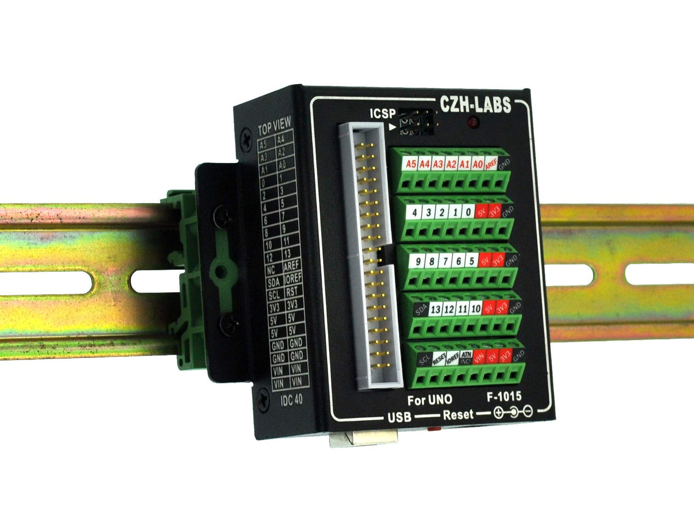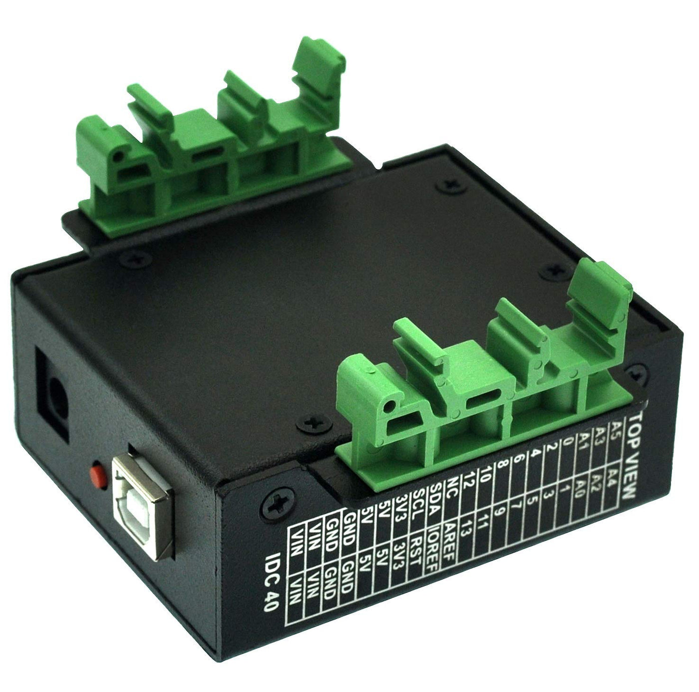 1, UNO Screw Terminal Block Breakout Module with Aluminum Enclosure. With the adapter module you can easily extend UNO projects to industrial control applications. Applications for Arduino UNO R2 / R3 ( NOTE: the item not include UNO module).2, Terminal block pitch 3.5mm/0.138", wire size range 26AWG to 16AWG, strip length 5mm, screw M2 steel, pin header and cage copper. Standard IDC40 pitch 0.1" header, you can use 40pin FRC(flat ribbon cable) connector cable connect all UNO pins to peripheral equipment. 6pin connector header support ICSP external connects.3, Support for Desktop, Panel mount, Wall-mount or DIN rail mount. DIN rail mount supports vertical or horizontal place mounting. Can support width 35mm / 32mm / 15mm rail.4, Enclosure: High quality aluminum enclosure, thickness 1.5mm/0.06", with attractive and extremely durable powder coat painting and clear laser marking labels. FR-4 fiber glass PCB, dual copper layers.5, Packing list: 1x Terminal Block Board(assembled standoffs and screws), 1x Aluminum enclosure(top and bottom covers), 5x M3x4mm Flat head screws(for top and bottom cover), 4x M2x6mm Standoff, 4x M2x6mm Flat head screw, 2x DIN rail adapter bracket, 4x M3x10mm Flat head tapping screw(for DIN rail adapter bracket). 1x 2x3pin header connector(for ICSP).