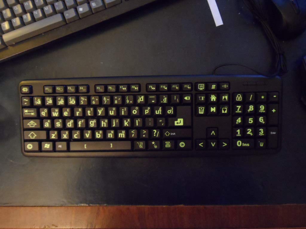 Multimedia Media symbols are compatible with both MAC and PC. These are commercial grade inlays, not printed letters on vinyl tape. An inlay can not wear out. Unlike printed or painted stickers which wear off from the oil in a person's hand, the letter or symbol goes from the front to the back of the chip. Each chip is a thick piece of vinyl, not a piece of tape. Before installing, the consumer should inspect the back of the sticker. If the symbol is not visible from the back, it will not hold up under normal use. Fluorescent paint or ink will begin to dull in weeks. Others spray black paint or ink over a yellow background. The Fluorescent ingredient in these chips goes all the way to the back. 36 point inlays in Arial Bold Font instead of the normal 24 pt. font, create symbols which are nearly 50% larger. The super stick adhesive that holds the vinyl will last a minimum of three years. The florescent Inlays are indelible and completely washable. They contrast with the black matte finish of the vinyl without causing glare which can irritate the eyes. A USB LED light, included at no additional cost, can be plugged into any USB port on a computer, laptop, or notebook. It can be twisted or bent and will retain that shape (like a Gumby doll). It also can be used with a USB telephone charger or a USB compatible battery as a night light. The light is rated at 1.2 watts and will use any power source from 2 to 5 volts. The life of the light is guaranteed for 40,000 hours of use. Your satisfaction is guaranteed. If you should damage a sticker as a result of problems with the application, we offer a "Mulligan" policy. Send us a picture of the unusable sticker(s) and we will replace all of the stickers at no cost. The best tool to apply the stickers is a tweezers. This will allow you to line up the stickers, making the job look neater. Type: English US Alphabet. Perfect for people with corrected vision or for the elderly.