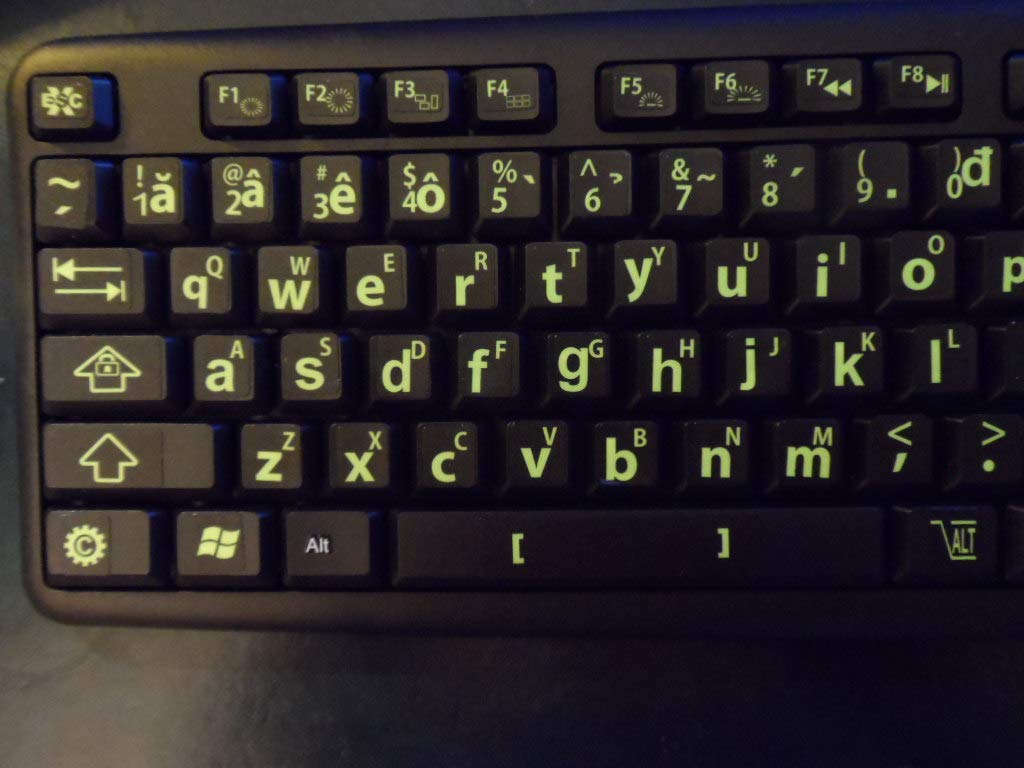 Vietnamese Keyboard Stickers with Fluorescent Inlays. Large Symbols Will Not Wear, Smudge or Fade. Vietnamese Conversion for All Laptop and Desktop Keyboards Also Free USB LED Light (White).