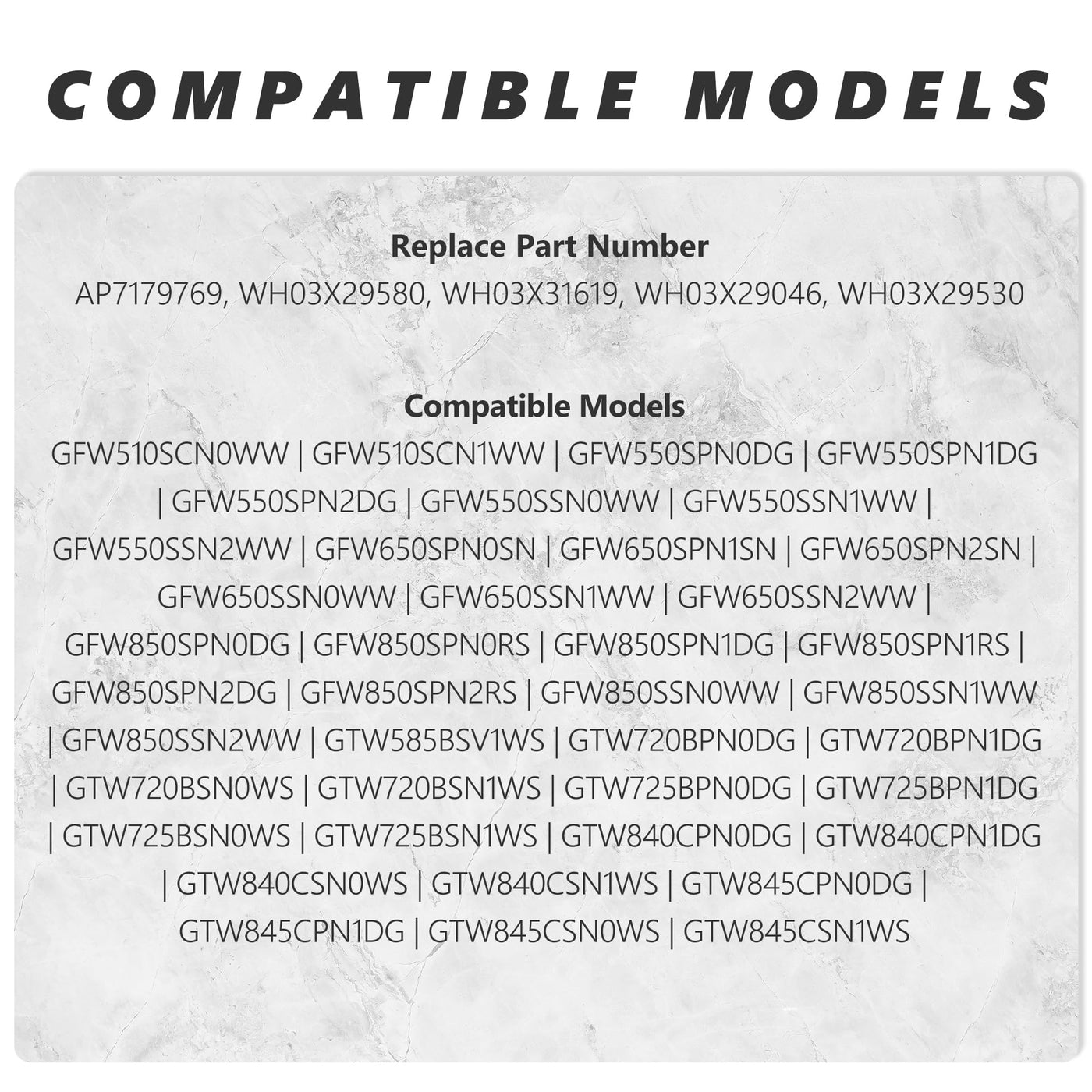 - Appliance Model: WH03X32138 is compatible with GE washer, please confirm the your model number first: GTW585BSV1WS GFW510SCN0WW GFW650SPN0SN GFW650SPN1SN GFW650SSN0WW GFW850SPN0RS GFW850SPN1DG GFW850SSN0WW GFW850SSN1WW GTW720BPN0DG GTW720BPN1DG GTW720BSN0WS GTW720BSN1WS GTW725BPN0DG GTW725BPN1DG GTW725BSN1WS GTW840CPN0DG GTW840CPN1DG GTW840CSN1WS GTW845CPN1DG GTW845CSN0WS GTW845CSN1WS
