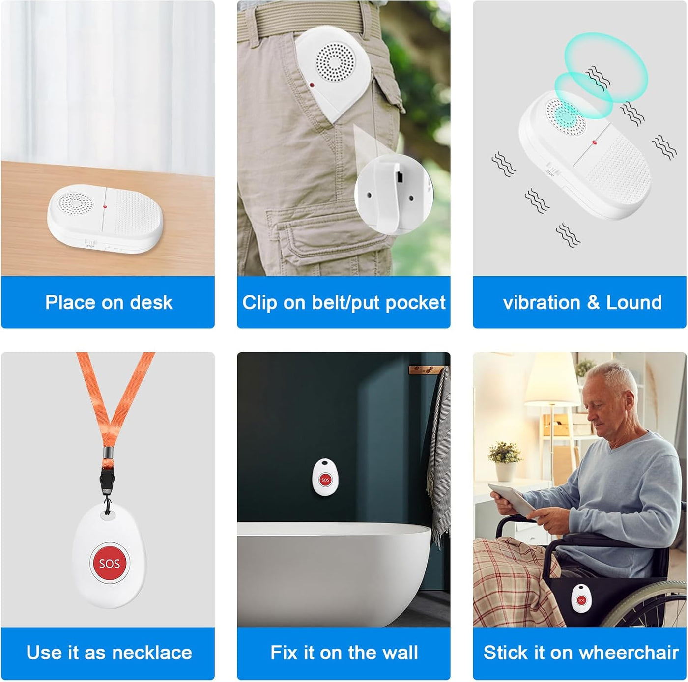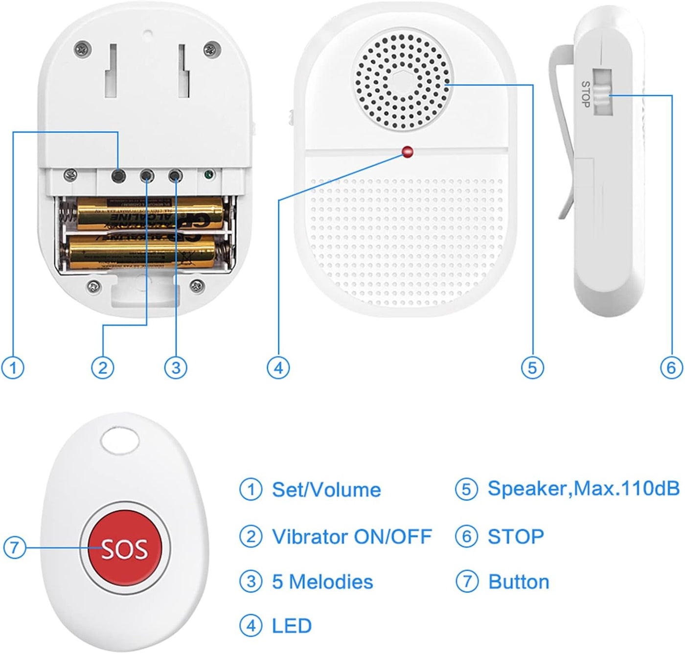 Wireless portable caregiver pager easily use and with IP55 waterproof call button.It alerts you with vibrations and peace sound when your kids or elderly need you/caregiver.Vibrations could remind people with poor hearing, especially suitable for elderly take care of each other.It is robust and lightweight and can be attached to your belt or tucked away in your pocket. Modern & stylish design Portable and easy installationReceiver with vibration,52 ringtones and LED light5 Volume Levels: 0dB-110dBIP55 waterproof call buttonApprox. 260+feet operation range (open air)Indoors operation range: 50+ feet The transmitter requires 2 CR2016 batteries and the receiver requires 2 AAA batteries which are already included. Reminder: Please switch "ON" before using the receiver. Who needs Call Button? Patients Disabled and Elderly Kids Pregnant Women Read more Who and Where use Caregiver Pager? Emergency Alert for Home Nurse Calling Alert System in Hospital Caregiver Pager for Nursing Home Especially Suitable for Elderly Take Care of Each Other Read more Easy to Use and Install Wireless Portable Vibration Pager with IP55 Waterproof Call Button This alert is portable.You can bring it anywhere you go! Never miss an alert around the allowed range. 52 Ringtones Vibration Alert 5 Volume Levels(0dB-110dB) 260+ feet Operating Range(open area) Indoors operation range: 50+ feet Change Ringtone and Pair Button with Receiver Step 1: Remove off the Belt Clip and Switch ON. Step 2: Choose a ringtone you like by pressing Music change button. Step 3: Long Press Volume button,you can hear one di sound. Step 4: Quickly press SOS button.You can hear the music you chose.Paired successly. Adjustable volume Step 1: Remove off the Belt Clip and Switch ON. Step 2: Short Press Volume Change button.You can adjust the volume from 0dB-110dB. Expandable One transmitter can call more than 50pcs of receivers at the same time. Each receiver can be paired with more than 50pcs of transmitters. Each receiver can configure different sounds for different buttons. Read more Package: 1x Receiver 2x AAA battery 1x Call button 2x CR2016 battery 1x Neck lanyard 1x Mini screwdriver 1x User manual Read more Door Window Pool Alarm with 1 Remote Control + 2 Magnetic Sensor Door Window Pool Alarm with 2 Remote Controls + 3 Magnetic Sensor 7Pack Door Window Alarm with 4 Working Modes Call Button Suitable for Caregiver Pager Wireless Dog Doorbell 1 Receiver + 2 Transmitters Operate range 50ft 50ft 260ft 800ft