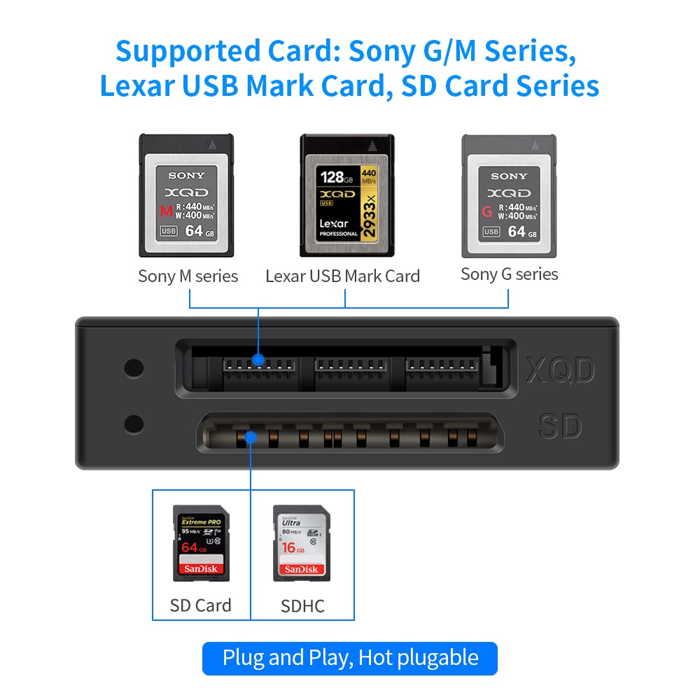 - Sony XQD Card ReaderDual slot SD/XQD reader is designed for photographers, which is easily to download pictures and videos from your XQD card reader to your laptops/computers via the USB 3.0 interface, offer you versatile transfer solution between multi-format memory cards and PC or tablet. Support XQD card and SD card at the same time.