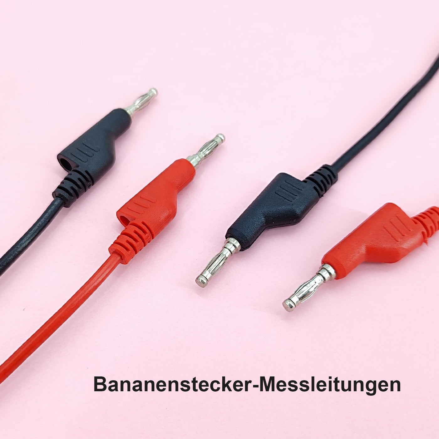 - The banana plug test leads have double-sided standard 4 mm banana plugs, which are also made of nickel-plated copper and have a non-slip PVC protective cover. They are oxidation resistant and provide good electrical conductivity. The stackable connector design allows for easy assembly and disassembly without tools. The cable length is also 1 metre and the voltage/current is 1000 V/15 A